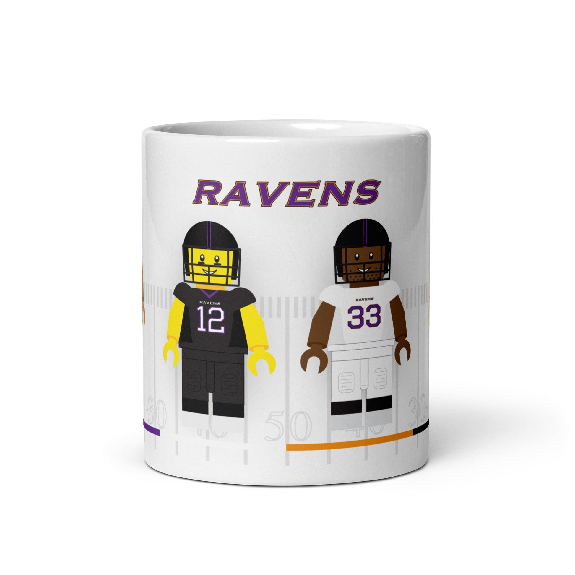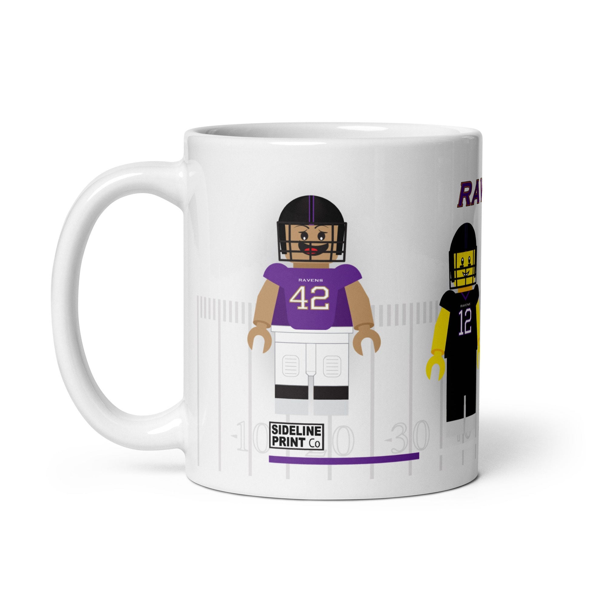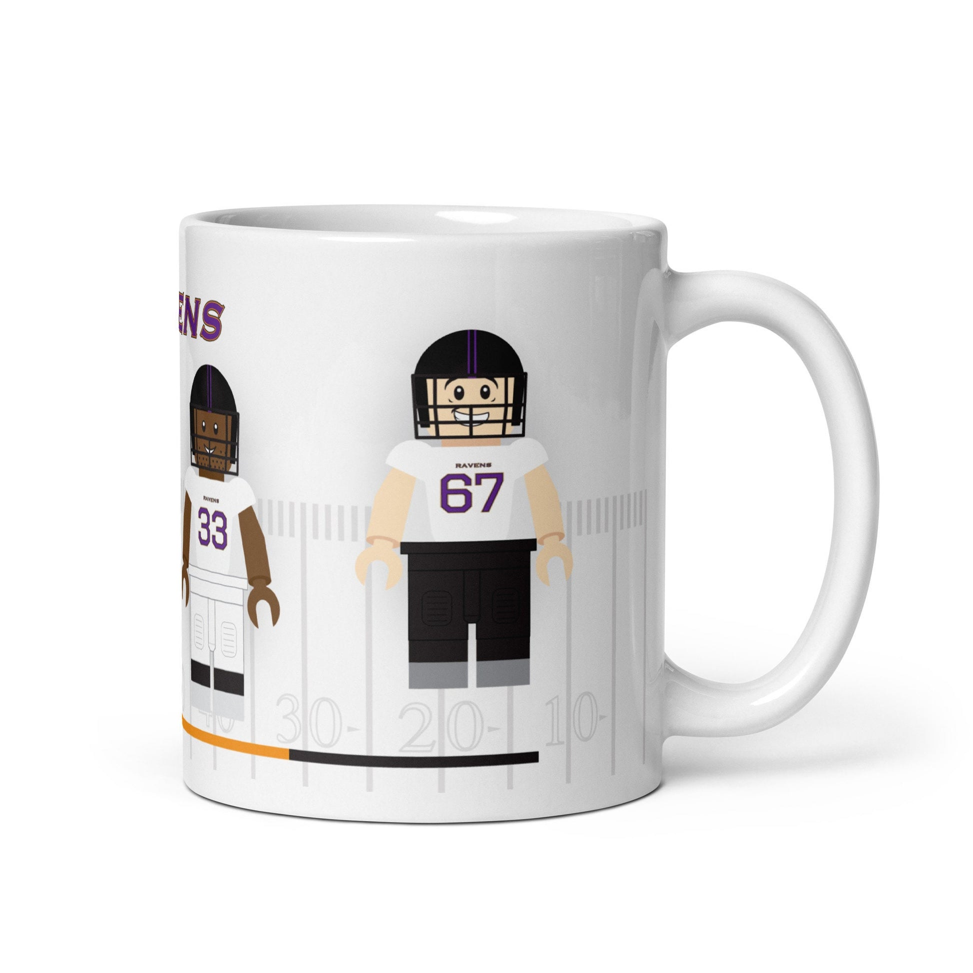 Fuel your Ravens pride with our Baltimore Ravens Lego Mug! Made from high-quality ceramic, this mug showcases four dynamic Ravens players in their distinctive home and away kits, depicted in captivating building block-inspired illustrations. Whether you're enjoying your morning coffee or unwinding with an evening tea, this mug is a stylish addition to your collection, perfect for any Ravens fan looking to show off their team spirit.