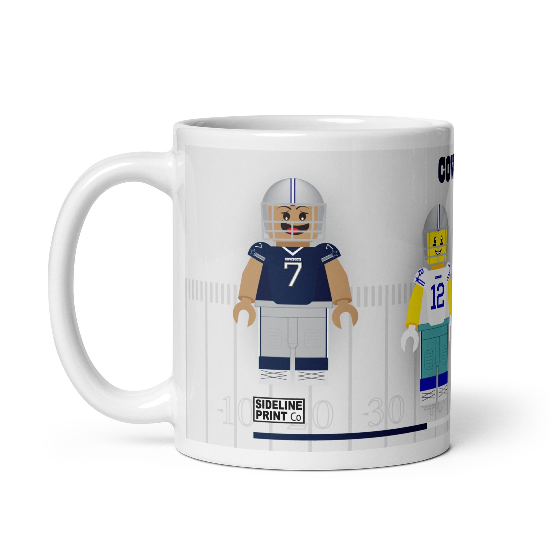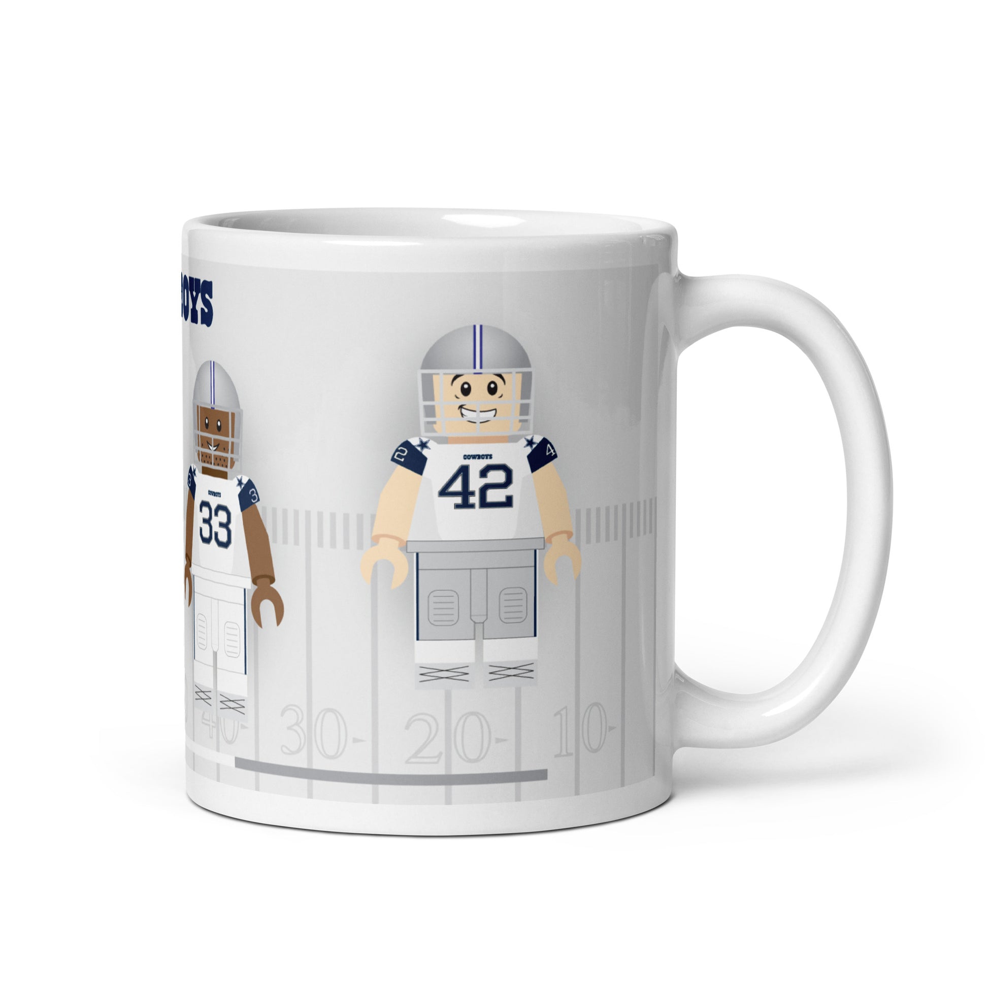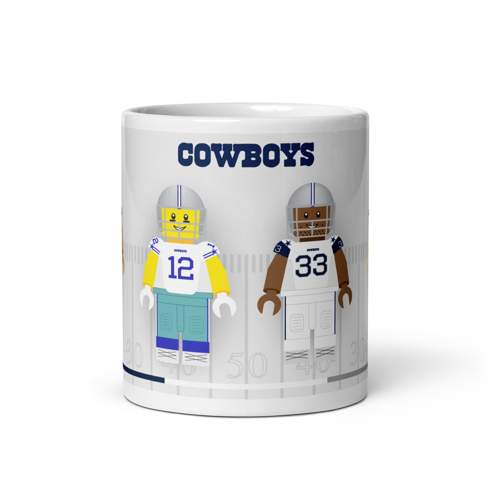 Saddle up for a touchdown with our Dallas Cowboys Mug! Crafted with the precision of a perfectly timed play-action pass, this ceramic masterpiece features four Cowboys players in their iconic navy blue and silver kits, all depicted in playful building block-inspired illustrations. It's like having a mini tailgate party with every sip! So, whether you're gearing up for a showdown at AT&T Stadium or simply need a boost, let this mug be your go-to choice for adding a touch of Cowboys pride to your morning routine.